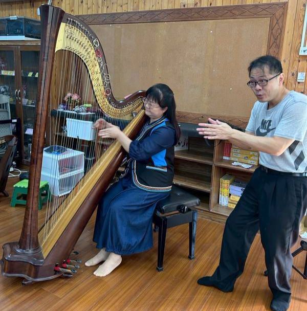 李哲音老師開場表揚的曲目為布農族語歌謠(媽媽的眼睛),孩子們不禁小聲跟著合唱,現場溫馨感人;接著演奏世界名曲「卡農」及「天空之城」,讓小朋友躍躍欲試,紛紛上台在李老師的指導下試著彈奏小豎琴,就連校長都忍不住要親自跟李老師學習演奏的技巧。