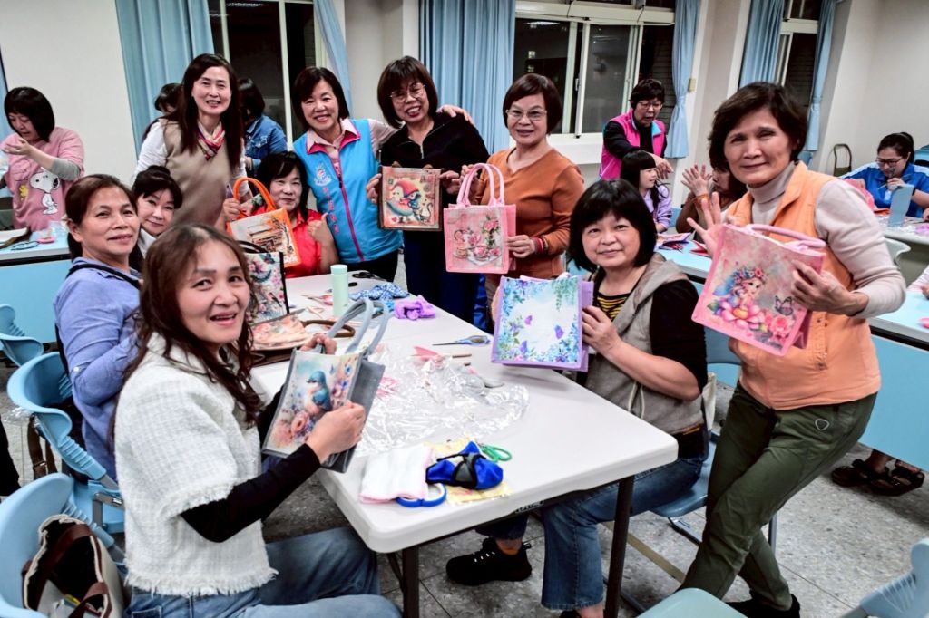 活動現場洋溢著笑聲與討論聲,學員們圍坐在一起,從配色選材、圖樣到構圖細節,彼此熱烈交流心得。完成作品後更迫不及待分享成果,情誼在一貼、一抹間慢慢凝聚,完成了一件件獨一無二的作品。游淑貞鄉長除了聆聽學員們的創意想法,也走近觀賞每件作品的細節與巧思,並與大家一起動手做,現場掌聲與笑聲此起彼落,氣氛溫馨熱絡。