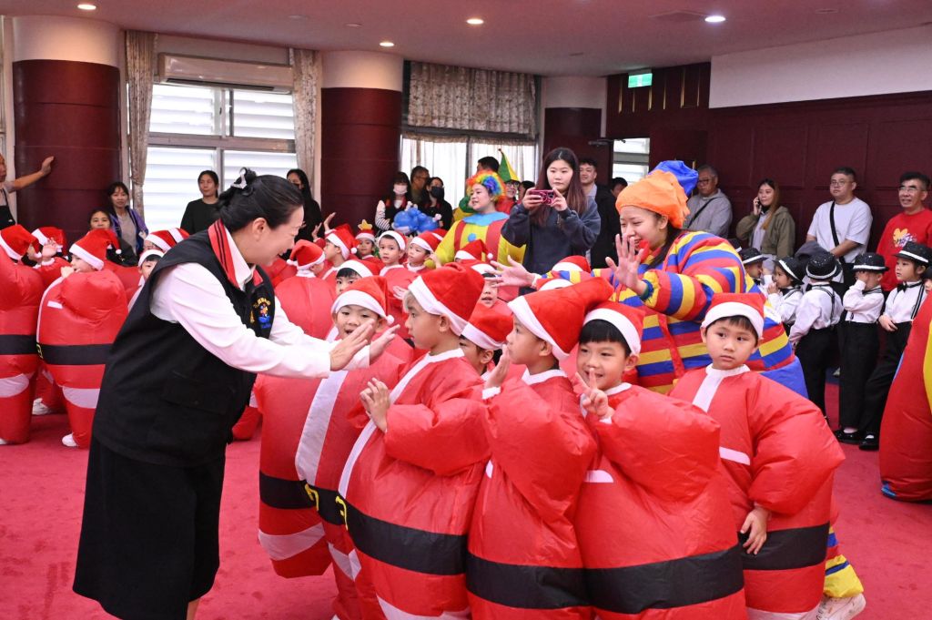 在老師們的帶領下,上百名小朋友打扮成耶誕老人、小天使、小雪人、柺杖禮物等,天真活潑地唱歌、跳舞,天真活潑地報佳音,家長及不少縣府同仁也拿起手機拍照合影,讓現場增添許多歡笑。