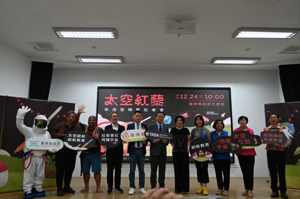 歷經七個月太空旅程的紅藜種子重返故鄉,今114年4月栽種在土坂vusam文化實驗小學內,結合實驗教育課程,於9月成功收成約20克的第一代太空紅藜,臺東縣政府特於今(24)日舉辦「黑盒子.紅寶石」太空紅藜種子頒贈記者會。縣長饒慶鈴表示,太空紅藜在臺東落地,不僅象徵文化與科學教育的並行實踐,也為縣府後續跨局處推動農業研究與產業應用奠定基礎,展現太空科學教育在原鄉扎根的具體成果。