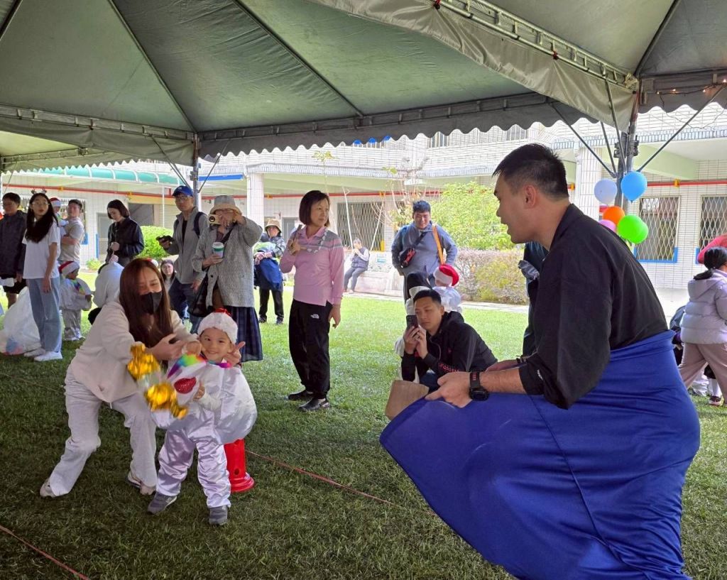 除了成果發表,草坪上的親子趣味競賽同樣熱鬧非凡。鄉幼精心設計趣味關卡,包括親子「花布雪橇」運送禮物、在「空氣棒雪花迷蹤」中考驗手眼協調,以及最受歡迎的「裝飾客家庄聖誕樹」。爸爸媽媽還有阿公阿嬤們暫時放下忙碌,在綠意盎然的大草皮上牽著孩子的手一起闖關,還有家長做聖誕老人造型配合遊戲拉著褲袋「接禮物」,現場歡笑聲與加油聲此起彼落。