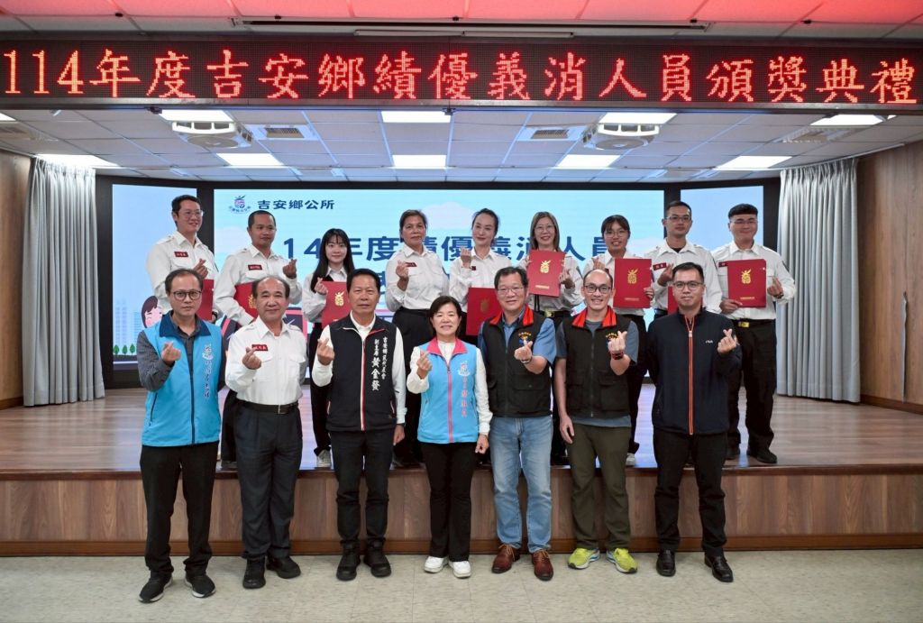 義工表揚大會中,鄉代會副主席黃金發與縣府災害預防王科長、警消簡大隊長、朱大隊長亦到場觀禮。黃副主席表示,消防與義消夥伴是「在烈陽下工作、在風雨中做事」的無名英雄,正因為有這群人默默堅守崗位,才能在動盪不安的時刻,給予社會大眾最踏實的安全感。王明忠科長也指出,防救災工作不僅止於災後搶救,更重要的是災前的宣導、預防與減災作為,而這群志工的專業不僅展現在火場第一線,更深入家戶關懷、弱勢救助與社區通報,為吉安鄉築起一道厚實而可靠的安全防線。