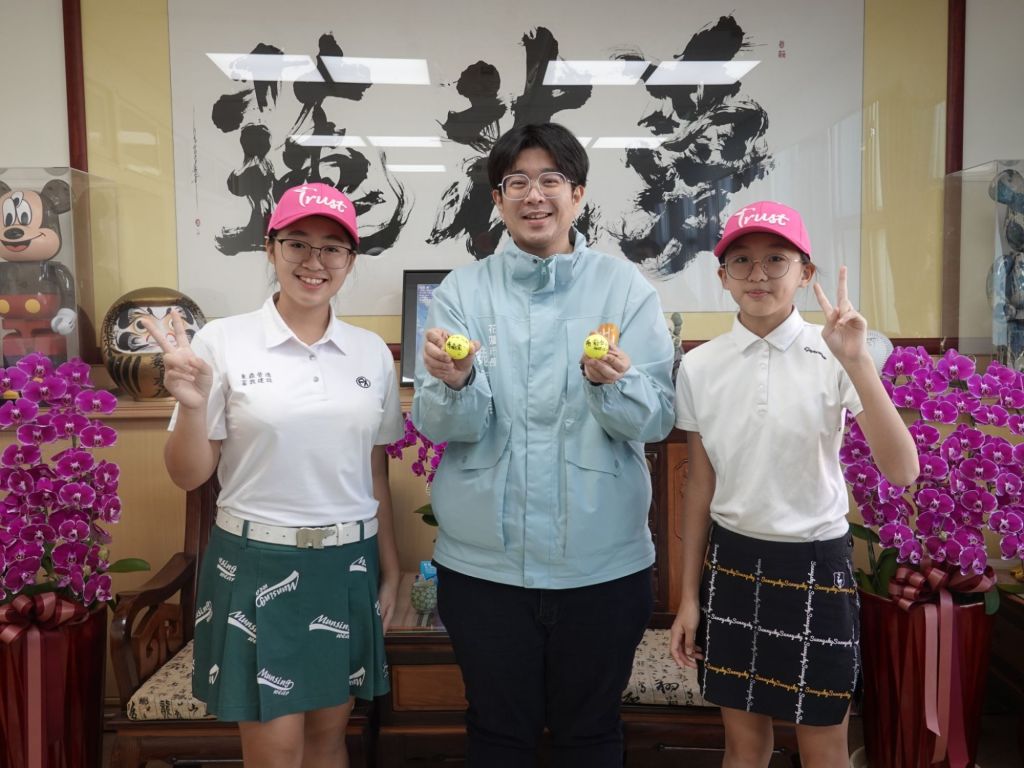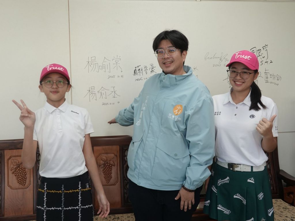 花蓮市高爾夫球小將在全國及國際賽事中表現亮眼,榮獲全國小學高爾夫錦標賽高年級女生組個人冠軍的楊喻丞,以及在2025新南向台灣青少年高爾夫錦標賽「女A組」奪冠的楊喻棠,姊妹二人今(31)日一同拜會市長魏嘉彥,分享比賽成果同時致贈簽名高爾夫球做為紀念。花蓮縣體育會高爾夫委員會總幹事黃兆禎偕同兩位選手的父親楊昌斌老師陪同出席,共同見證孩子努力耕耘的榮耀時刻。