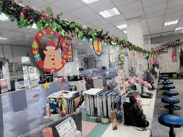 此外,隨著歲末腳步逐漸接近,為營造溫馨、友善且富有節慶氛圍的洽公環境,並迎接溫馨的聖誕佳節,萬榮戶政事務所精心規劃「聖誕幸福.戶政相伴」主題布置活動,透過巧思設計將辦公室櫃檯及洽公空間融入聖誕樹、燈飾及節慶小物,營造明亮溫暖的節日氛圍,讓民眾在洽公之餘,也能感受到節慶的喜悅與祝福,為寒冬注入一股暖流。值得一提的是,本次布置多數素材由同仁自行發想、共同製作,運用隨處可得之環保材料、簡約裝飾及可重複使用物件,落實節能減碳與永續理念。更結合在地特色,融入水鹿布景,讓公共空間不再只是行政場域,更成為傳遞關懷與情感的交流場所。