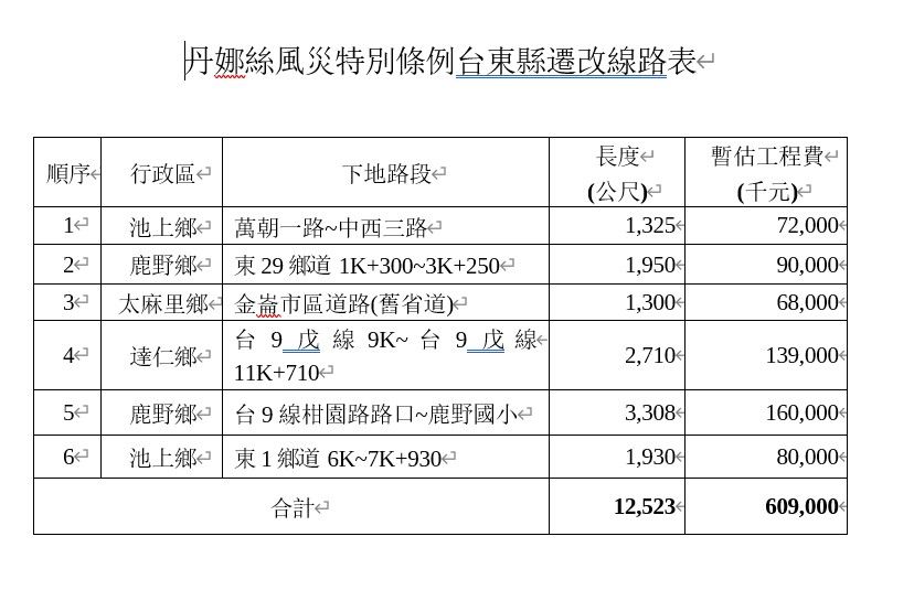 此次台東電纜地下化工程,涵蓋池上鄉「萬朝一路至中西三路」、鹿野鄉「東29鄉道1K+300至3K+250」、太麻里鄉「金崙市區道路-舊省道」、達仁鄉「台9戊線9K至11K+710」、鹿野鄉「台9線柑園路路口至鹿野國小」、池上鄉「東1鄉道6K至7K+930」等6處路段,經費分別為7,200萬元、9,000萬元、6,800萬元、1億3,900萬元、1億6,000萬元及8,000萬元,合計約6億元。其中池上鄉「萬朝一路至中西三路」已於去年11月動工,其餘5案將於今年上半年陸續動工,經費來源為「丹娜絲重建特別條例」。