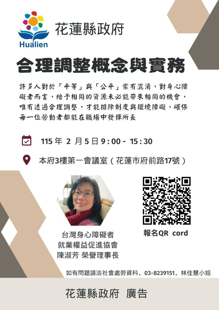 為落實《身心障礙者權利公約(CRPD)》精神,回應多元勞動力趨勢,花蓮縣政府社會處將於115年2月5日假本府第一會議室辦理「合理調整概念與實務」課程,透過系統化課程與實務導向的內容,協助雇主、主管與第一線專業人員正確認識「合理調整」,進而在職場中實踐真正的公平與包容。