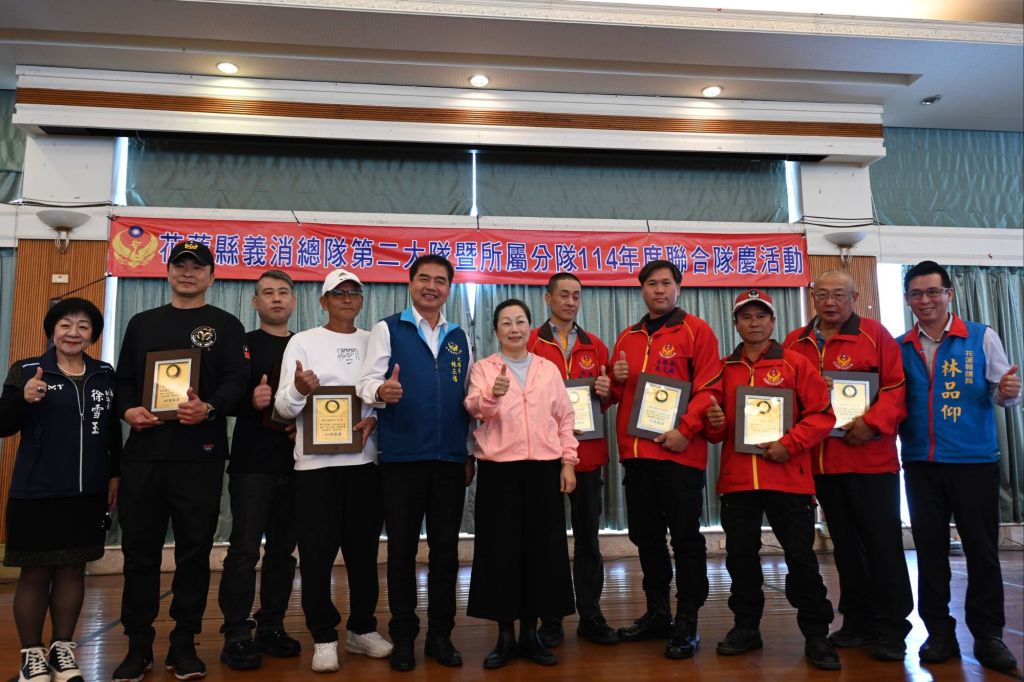 花蓮縣消防局義消第二大隊及所屬分隊於今(17)日在壽豐鄉怡園渡假飯店隆重舉行「114年聯合隊慶活動暨頒獎典禮」。花蓮縣長暨義消總隊長徐榛蔚親自出席,為長期守護鄉親生命財產安全的消防與義消同仁頒獎,肯定其英勇奉獻的精神。