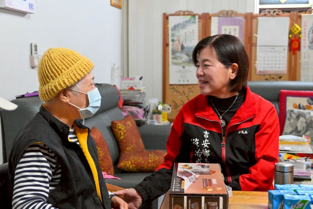 親送祝福、溫暖長輩心!農曆春節將至,為讓鄉內長輩感受濃濃年節溫暖,吉安鄉公所全面啟動歲末關懷行動。鄉長游淑貞關心獨居長輩的生活起居,特別準備實用貼心的年節禮品,關懷鄉內180位獨居老人及40位65歲以上關懷戶。昨(21)日下午,游淑貞鄉長偕同東昌村長魏錦添、宜昌村長黃志源及公所團隊,親自前往83歲的賴奶奶與82歲的劉奶奶家中訪視,親切詢問生活近況,讓長輩在寒冬中感受到如家人般的溫馨關懷。