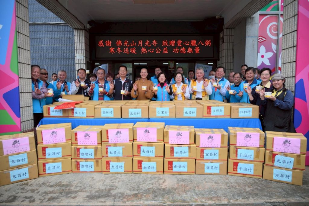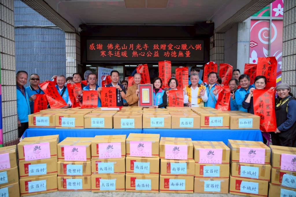 和諧共生、馬到成功!為慶祝佛陀成道紀念日,佛光山月光寺妙勳法師及師兄姊們,今(26)日親自將2000份細心熬煮的臘八粥親送吉安鄉公所,由各村村長、志工們協助分送至各村鄰,傳遞歲末溫暖關懷與祝福!鄉長游淑貞親自迎接受贈,感謝寺方多年來共力吉安鄉的照顧,同時希望這一份滋補暖心的臘八粥,為大家帶來平安滿溢的幸福味,更祈祝新的一年闔家安康。