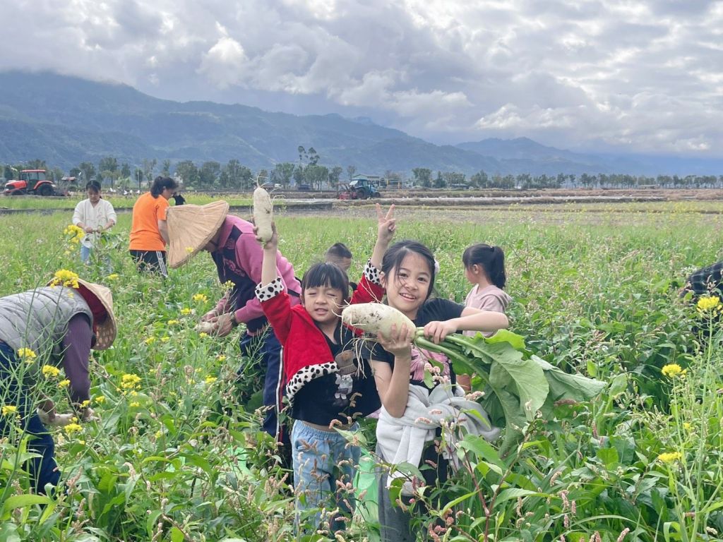 清晨的陽光灑在大禹社區的蘿蔔田裡,泥土的氣味混著笑聲,一場溫暖又動人的學習正在發生。孩子們蹲在田埂邊,雙手緊握蘿蔔葉,用力一拔,白胖的蘿蔔從土裡冒出來,孩子興奮地大喊:「我拔到了!」這不是單純的農作體驗,而是一場跨越年齡、世代共學的生命教育。