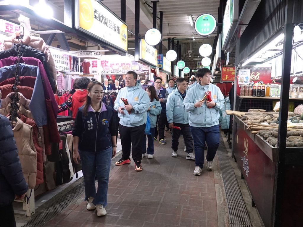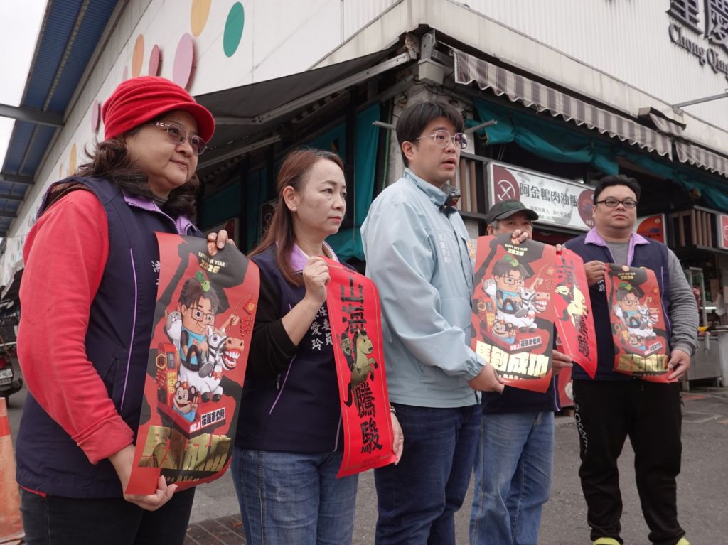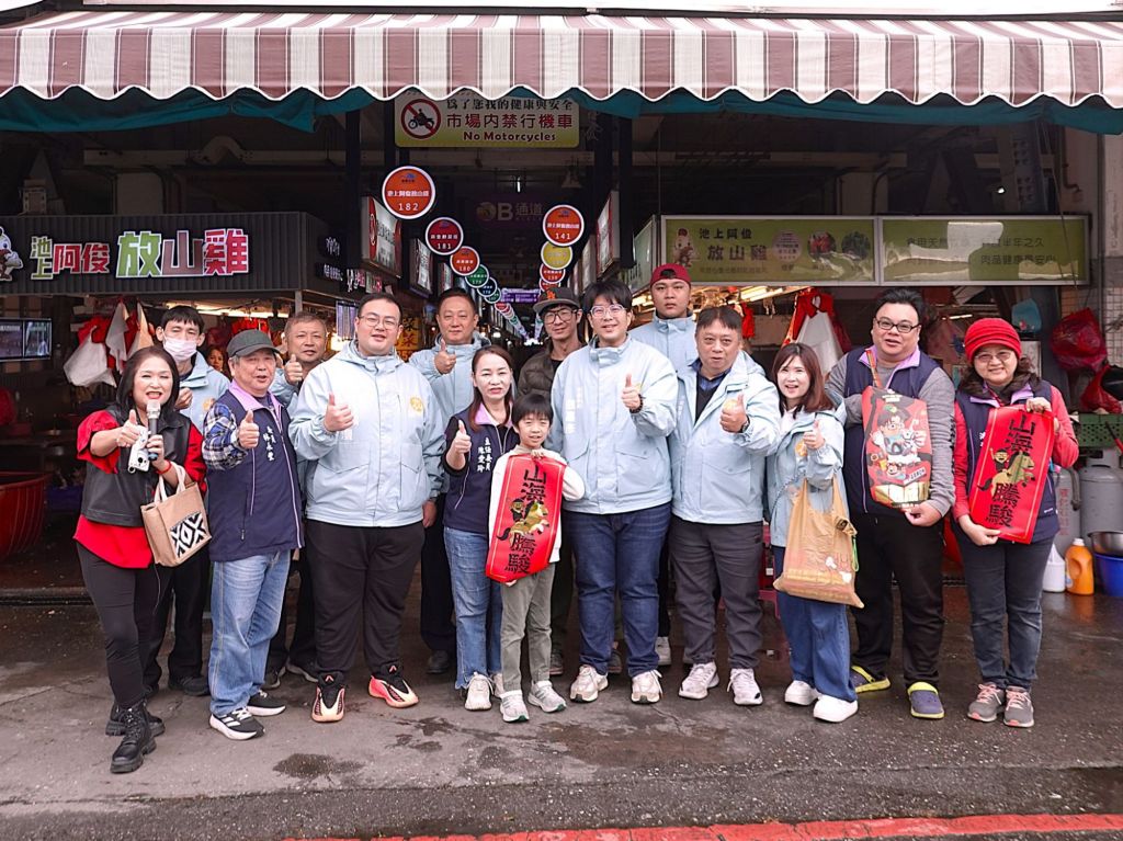 魏嘉彥與楊哲灃一一向攤商寒暄問候,感謝市場攤商長年為消費者提供新鮮食材與便利服務,也祝福大家新的一年生意興隆、闔家平安。