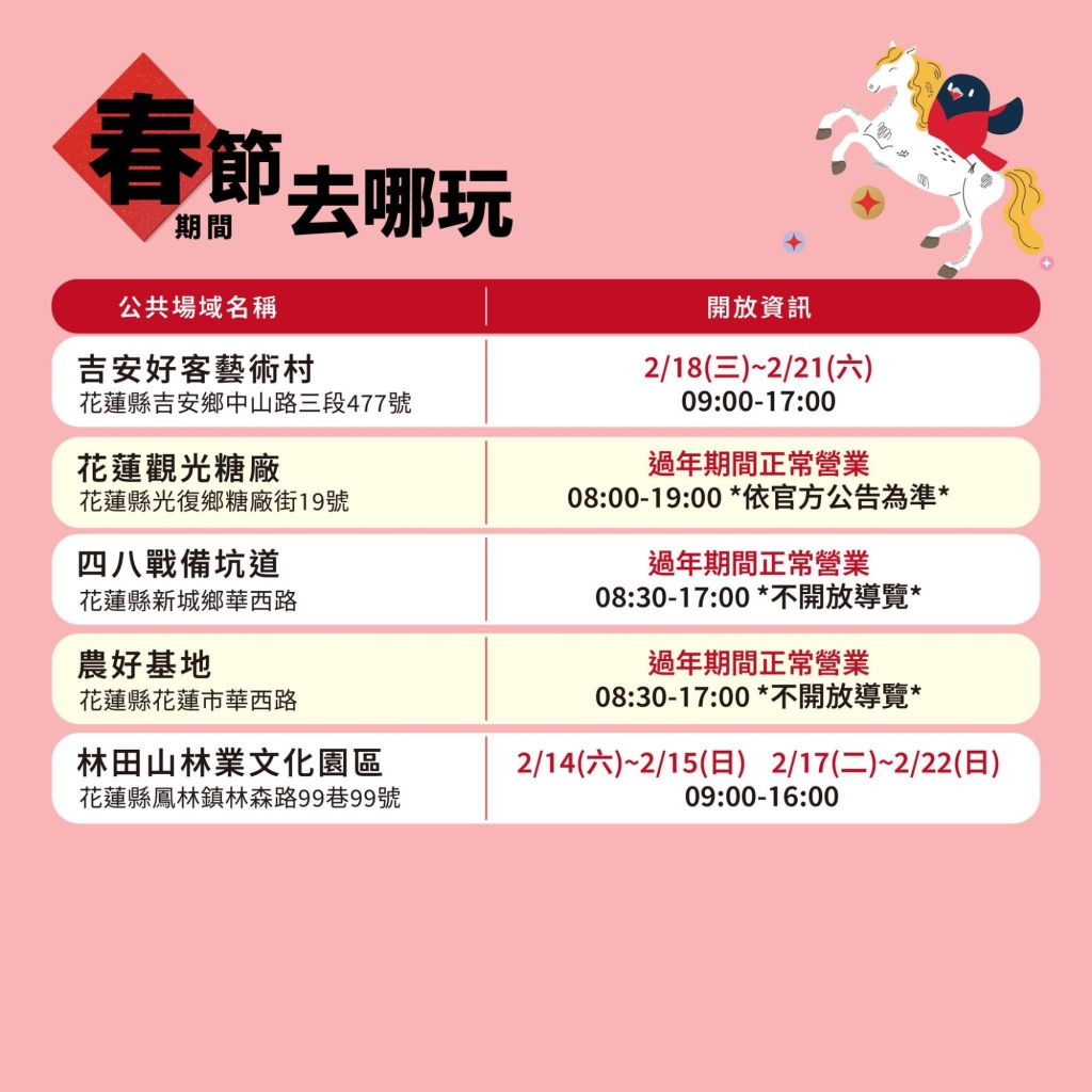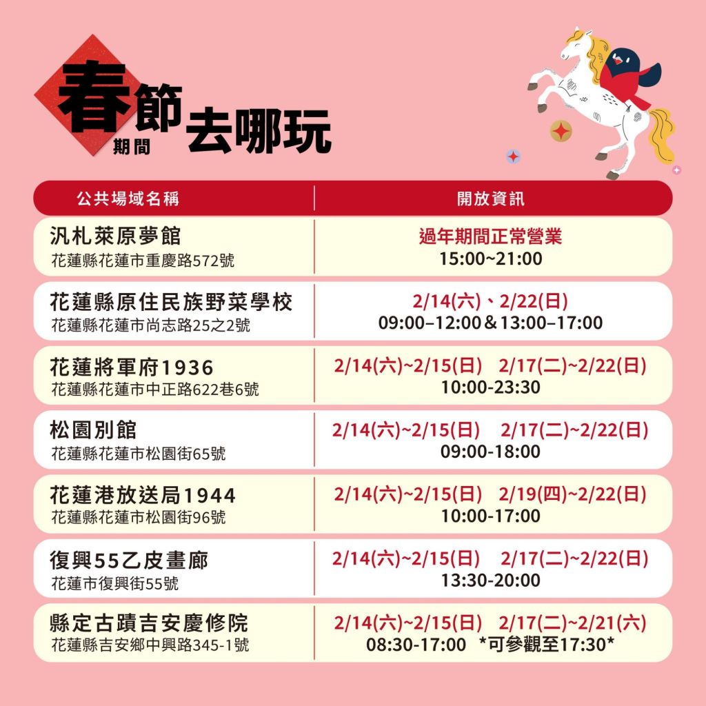 花蓮特色遊程眾多,縣長徐榛蔚推薦大家把握即將到來的春節連假到花蓮走走,花蓮縣政府彙整春節期間公共館舍與活動資訊完備,包括原住民野菜學校、將軍府1936、松園別館、花蓮港放送局1944、復興55乙皮畫廊、吉安慶修院、吉安好客藝術村、花蓮觀光糖廠、四八戰備坑道、農好基地、林田山文化園區、石雕博物館、美術館、鐵道文化園區、文化創意產業園區、考古博物館、文化局臨時圖書館、客家文化會館等,過年期間皆有開放參觀,詳情資訊可洽花蓮縣政府臉書https://reurl.cc/QVMYEO 及縣長徐榛蔚臉書https://reurl.cc/oKj8yD ,以掌握即時開放時刻與交通相關注意事項。