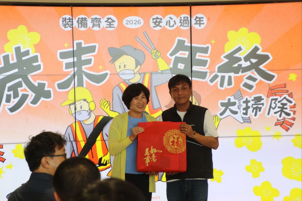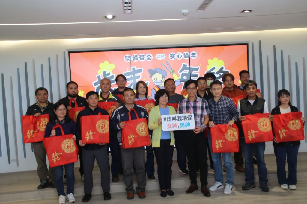 饒慶鈴與環保局長黃權煒、各公所清潔隊長共同誓師,宣告歲末大掃除正式啟動,縣長並致贈賀歲紅包,祝福大家馬年行大運;饒慶鈴表示,清潔隊員長年默默守護城鎮環境,是維護臺東整潔與生活品質最溫暖、也最堅實的力量。尤其年終歲末,家戶大掃除使垃圾清運量明顯增加,第一線作業風險隨之提高,縣府特別重視清潔隊員的工作安全,主動規劃並採購防穿刺手套、耳罩、口罩及袖套等防護裝備,提供隊員於勤務中使用。未來也將持續與各鄉鎮市公所攜手,爭取相關經費,逐步提升清潔隊裝備與作業條件,打造更安全、友善的工作環境。