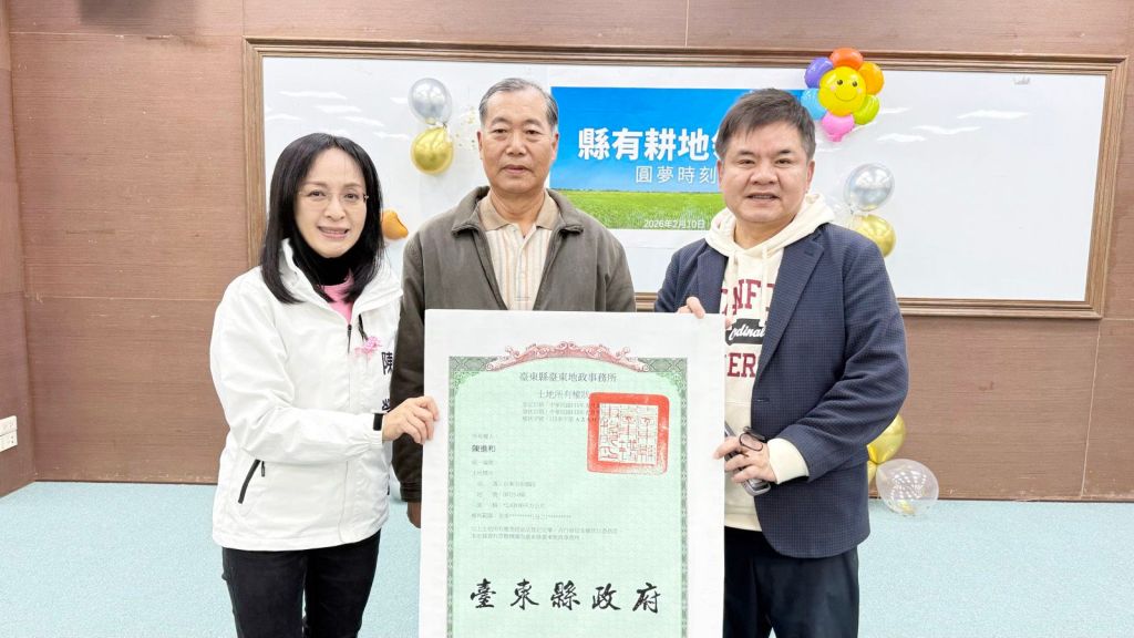 立法委員陳瑩、莊瑞雄長期在立法院推動公地放領政策,針對停辦逾十七年的土地正義問題,多次提案並質詢行政院,要求中央政府正視實際耕作者長期無法取得土地所有權的困境。隨著政策逐步落實,台東首波公地放領案於上個月中獲內政部核定通過。昨(10)日,陳瑩出席台東縣政府舉辦的公地放領頒狀儀式,與饒慶鈴縣長共同見證台東首件公地放領案完成。陳瑩表示,對農民而言,這是遲來的正義,是政府兌現數十年前的承諾,還給他們應有的「公道」!