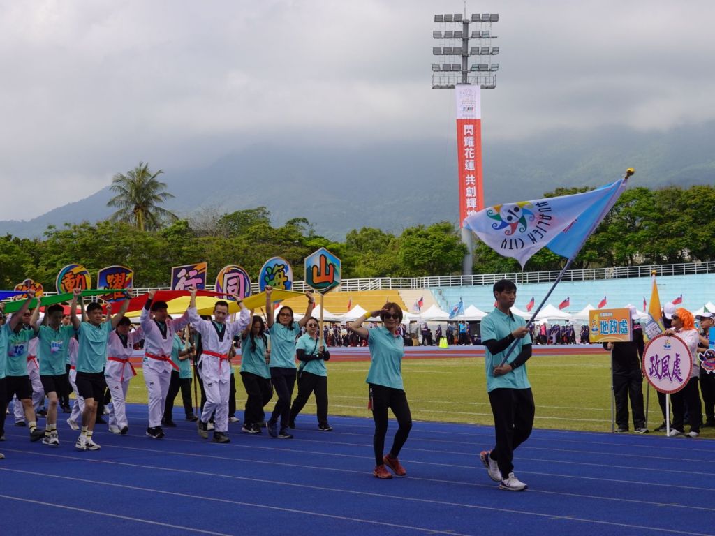 花蓮市公所此次創意進場以藍、綠、紅、金四種顏色象徵花蓮的山海與城市精神,伴隨著「山海同行、躍動花蓮」的大字標語進場。藍色代表海洋,公所同仁以游泳造型裝扮進場;綠色象徵山林,則以田徑運動造型呈現;紅色代表突破,同仁們以跆拳道意象象徵勇氣與挑戰;金色則象徵創造與榮耀,透過射箭造型展現精準與目標。