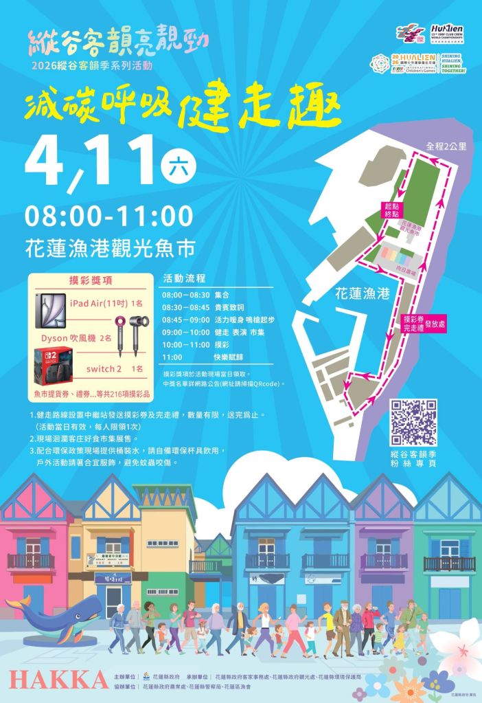 客家事務處長潘乾鑑表示,客家文化向來重視勤儉節約與自然和諧共生的精神,這與當前推動減碳永續的理念不謀而合。此次活動以健走為主軸,同時現場亦結合環保局、觀光處等單位政令宣導活動,提升民眾對環境保護與永續發展議題的認識,鼓勵鄉親以最環保的方式認識花蓮之美,希望鄉親在輕鬆愉快的氣氛中,深刻感受客家人對土地的情感與對永續環境的承諾。誠摯邀請鄉親,共下來花蓮漁港觀光魚市遶尞,共同留下美好的假日回憶!