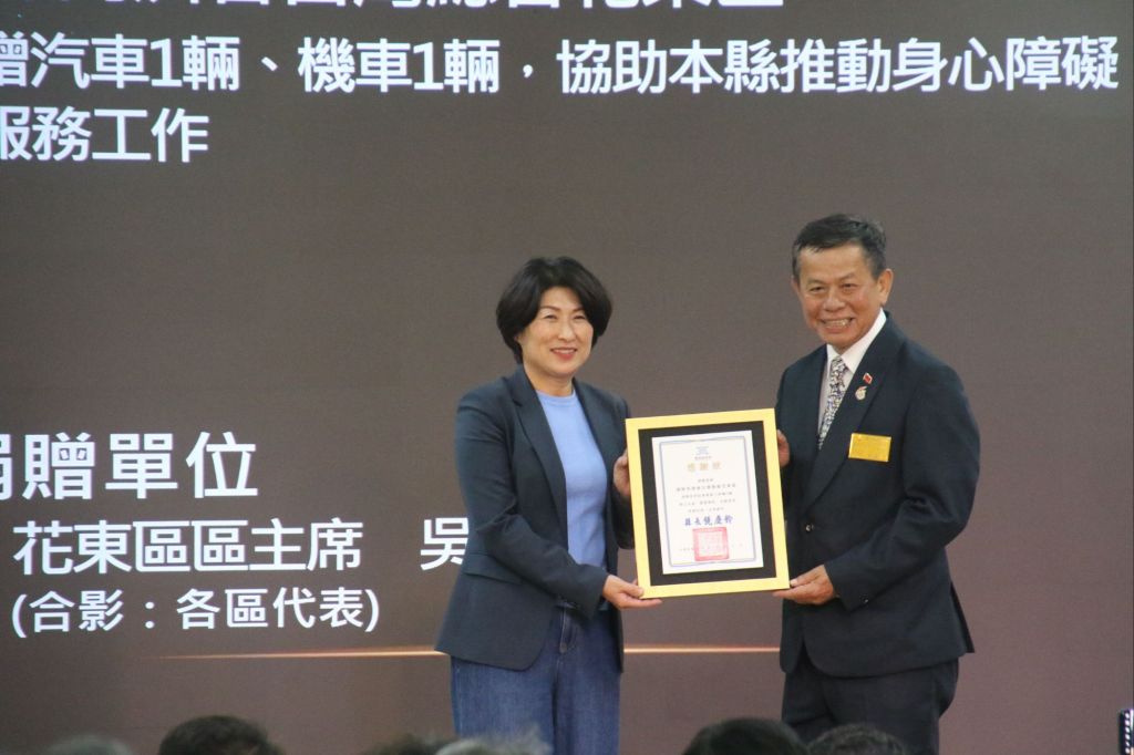為提升偏遠地區及身心障礙者服務量能,國際同濟會台灣總會花東區慷慨捐贈汽車1輛及機車1輛,總價新臺幣100萬元整,協助縣府社會處推動自閉症(星兒)青年及成人潛能開發與外展服務工作。臺東縣政府特於今(9)日縣府擴大主管會議,邀請捐贈單位花東區主席吳漢俊與會,並由縣長饒慶鈴致贈感謝狀,感謝民間團體長期關注社會公益議題,以實際行動力挺偏鄉,讓關懷與陪伴能跨越距離,走進更多需要支持的角落。