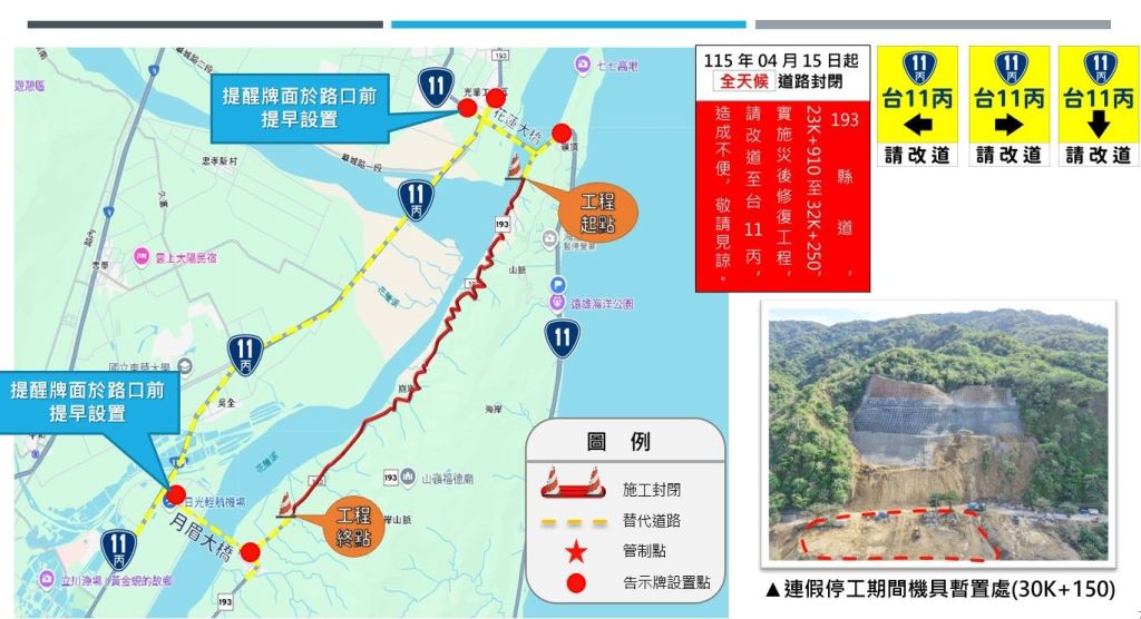 - 縣道193線24k+000~30k+150,採全路段封閉,封閉時間115年4月20起至117年2月28日(全天候封閉)。