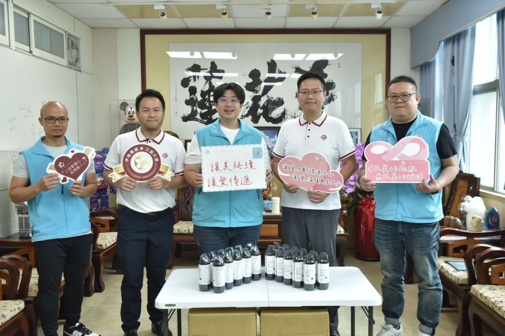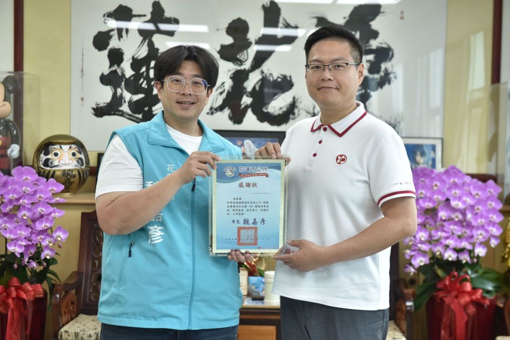 花蓮市實物銀行日前獲伊絲碧媞國際股份公司捐贈洗髮精及沐浴乳各700瓶,為實物銀行的物資存量再添助益。市長魏嘉彥特地頒贈感謝狀予自桃園遠道而來的總經理陳睿紳。魏嘉彥表示,伊絲碧媞兩年前便已捐助過洗沐用品來幫助我們,非常感謝他們今年再次來到花蓮,相信能為弱勢族群帶來相當大的幫助。