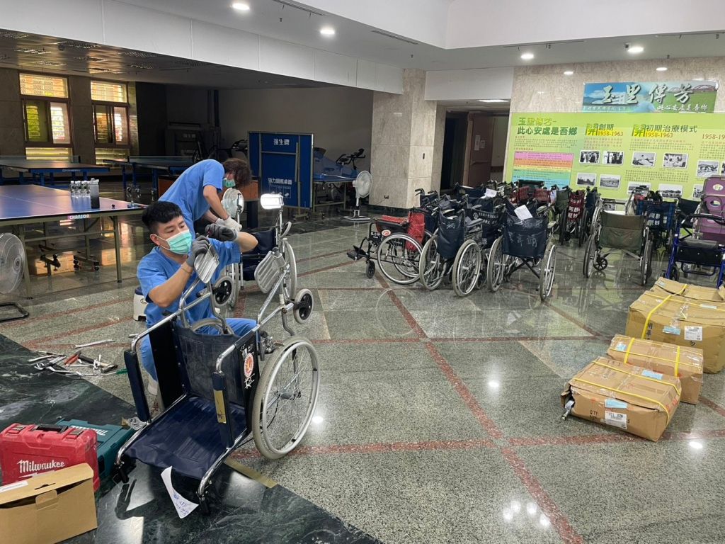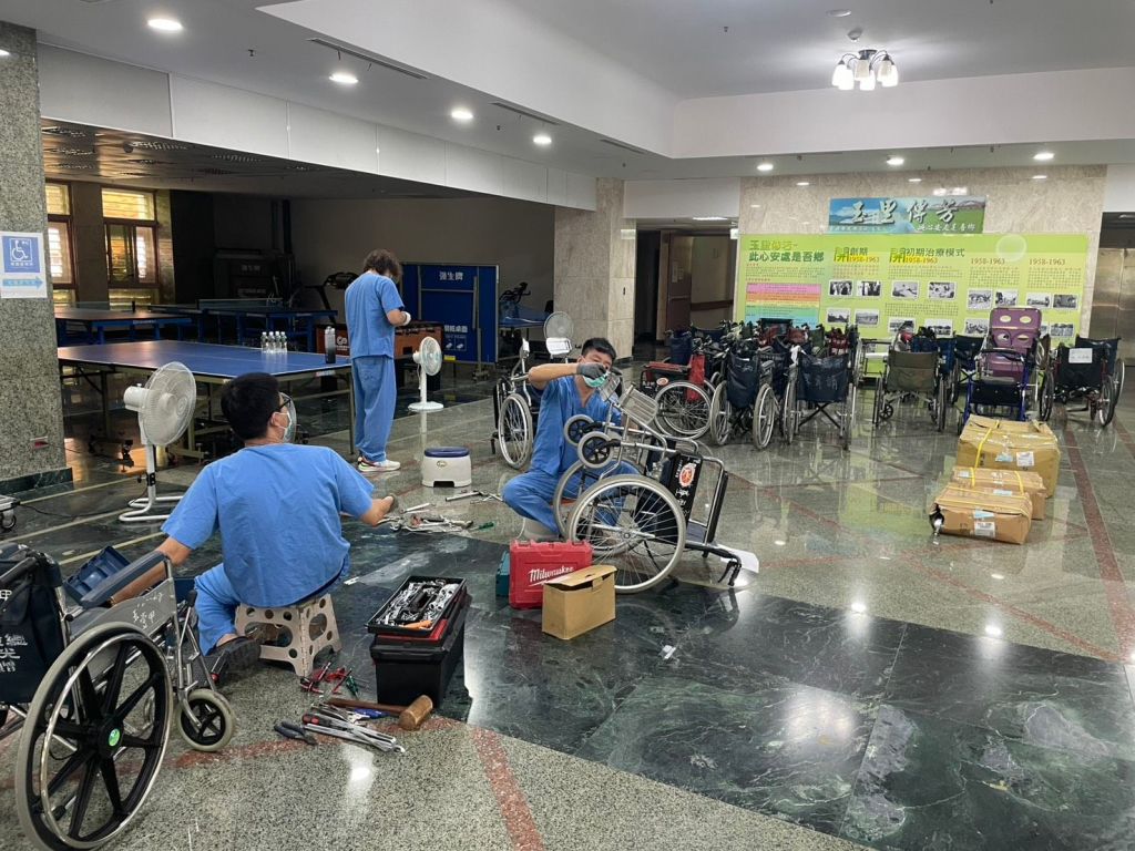 此次維修聚焦於住院期間日常使用的各類輔具,包含輪椅、便盆椅、助行器及手杖等,由總院維修人員現場逐一進行檢測、調整與零件更換,即時排除輔具使用問題,有效提升輔具穩定性與安全性,減少潛在風險,讓榮民在住院期間也能維持良好行動能力與生活品質。維修現場中,維修人員細心檢視輪椅結構與功能狀況,進行拆解保養與精準調整,展現高度專業與效率;同時也協助醫院進行輔具整體盤點與維護,強化院內輔具管理機制,確保各項設備維持最佳使用狀態。