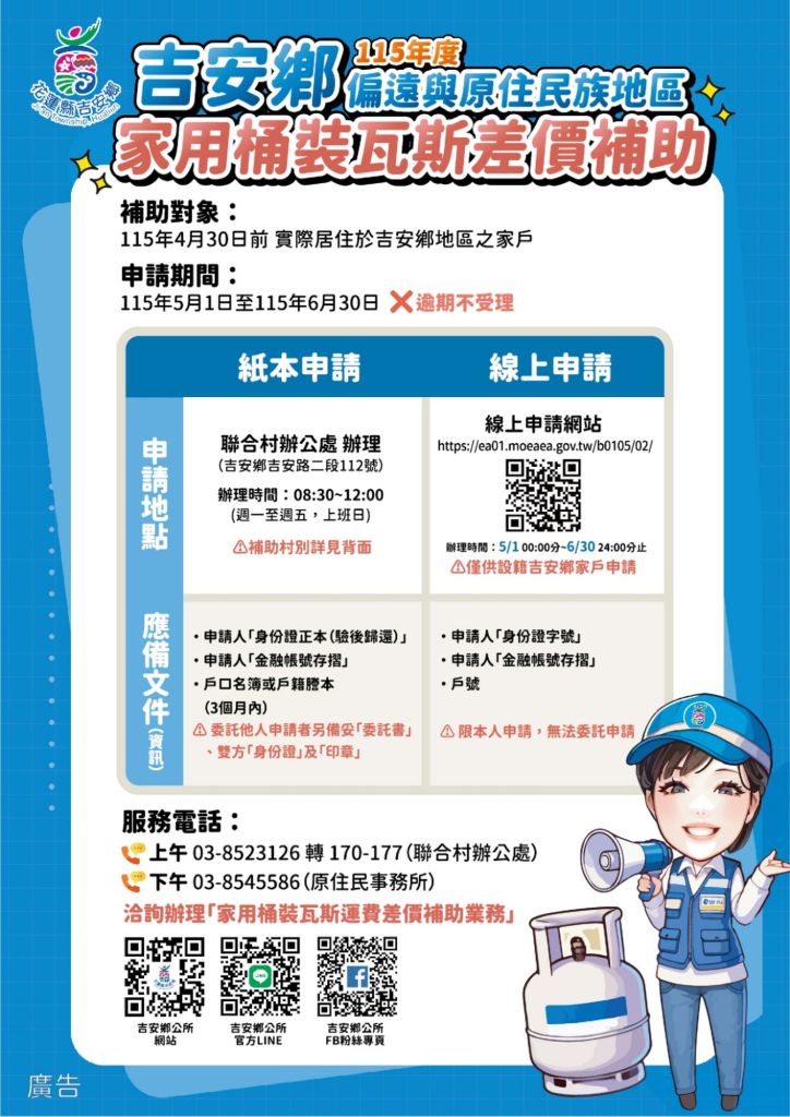 吉安鄉公所為減輕偏遠與原住民族地區家戶的負擔,縮短因交通不便導致的民生價差,5月1日起配合經濟部能源署政策,全面開辦115年度「家用桶裝瓦斯差價補助」申請作業。鄉長游淑貞提醒鄉親注意截止日期至6月30日,符合資格的家戶請把握期限,保障自身權益,讓政府的美意可以嘉惠每個家庭。