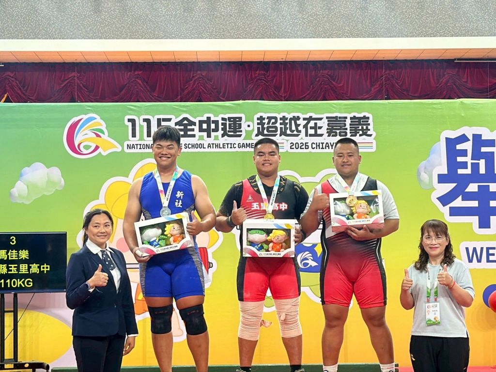 玉里高中舉重隊同樣表現出色,高男組+110公斤以上級由馮佳樂勇奪金牌,以抓舉133公斤、挺舉180公斤、總和313公斤締造個人最佳成績。馮佳樂目前就讀體育班二年級,此次比賽全面突破自我,表現亮眼,並將於4月26日代表臺灣前往埃及參加2026年世界青年舉重錦標賽,備受期待。另同級選手那聖恩亦勇奪銅牌,同樣表現出色。