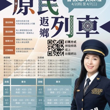 台灣即新聞 記者 楊金明/臺東報導 基於原住民族文化傳承,便利族人返回之交通,每年春假、七八月及年 … More 2026年春假-原住民返鄉列車-開始訂票囉! 陳瑩成功催生「原民列車」營運邁入第11年